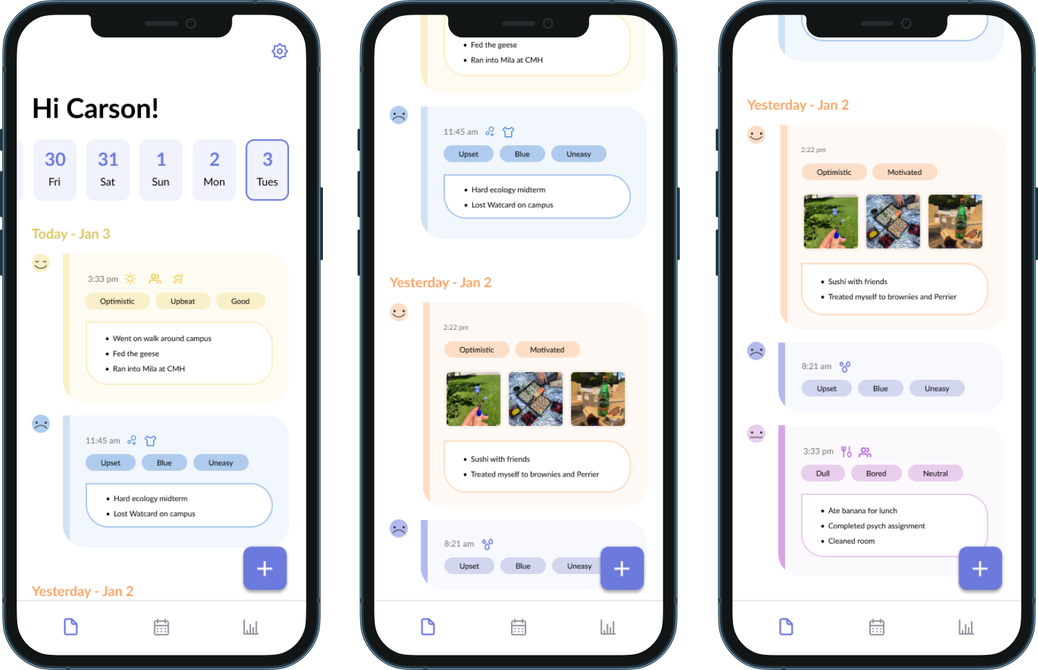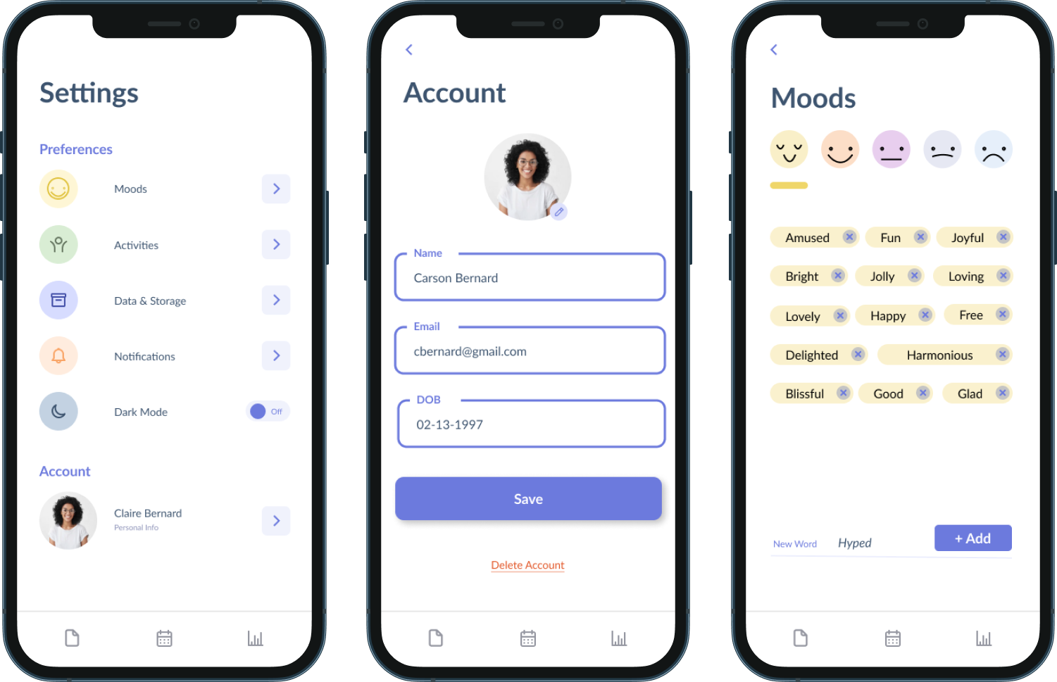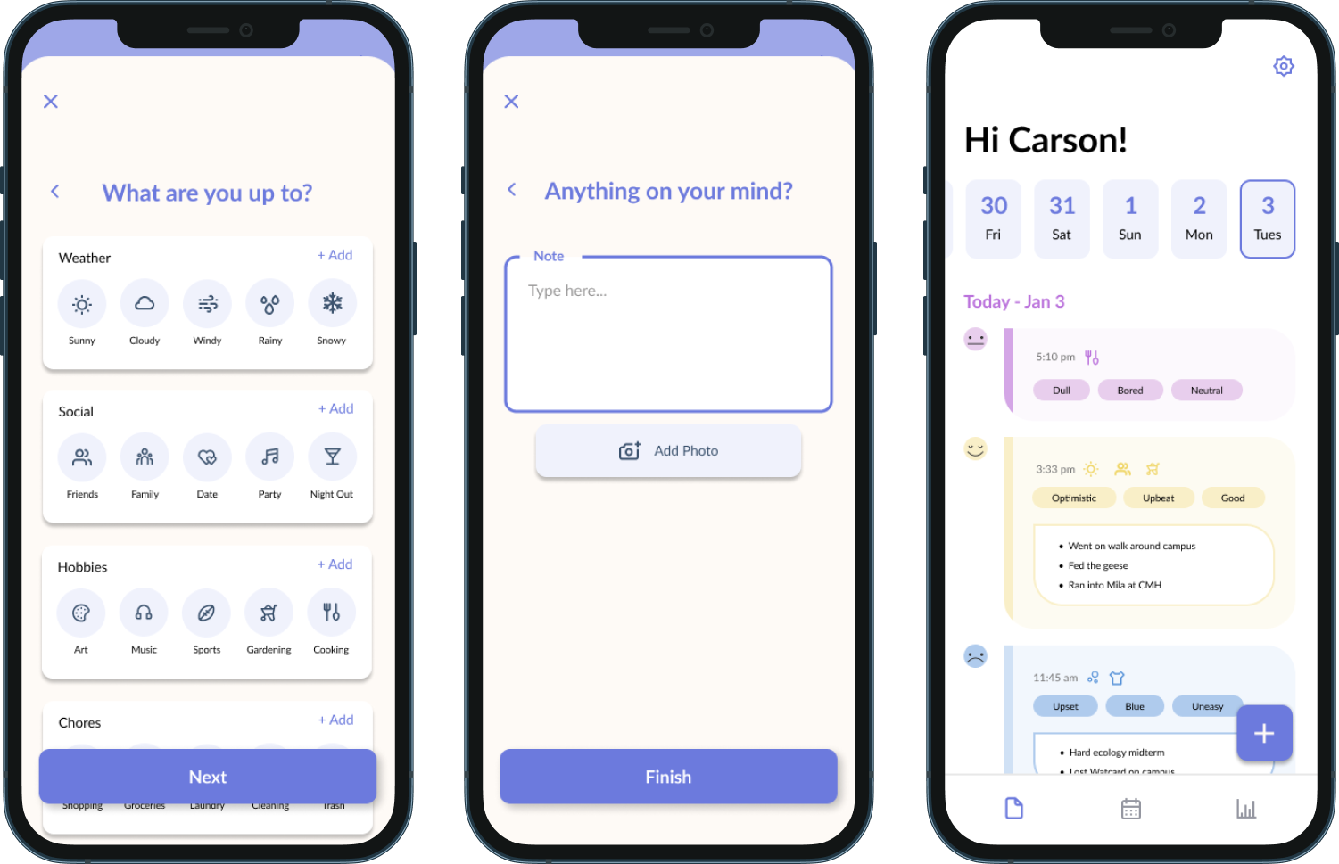 Being the central feature of the app, the journal entry process is designed to be straightforward and engaging. Users are first prompted to share their current mood, first expressed in simple emotes, then in more descriptive language. Users are then given the option to select relevant activities, wrapped up with an option to add any relevant notes or photos to the entry. All done! The last two parts of the entry are entirely optional, providing a great amount of flexibility for the user.